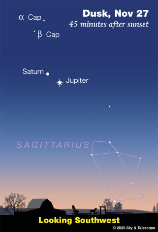 24 November 2020 – “Speaking with the Stars”:Mars shines about a fist-width to the upper left of the waxing gibbous Moon this evening.
